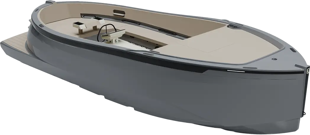The layout is optimised for weight distribution and centre-of-gravity balance. Seating modules are structurally integrated into the hull, storage is recessed to maintain clean deck lines, and helm positioning is designed for standing or seated high-speed operation. Electrical and plumbing systems are modular for reliability and serviceability.