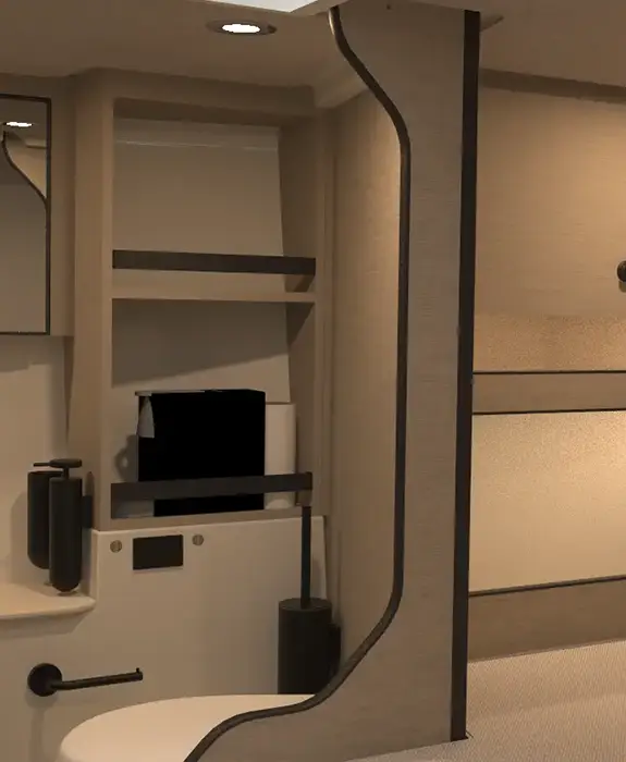 The layout is optimised for weight distribution and centre-of-gravity balance. Seating modules are structurally integrated into the hull, storage is recessed to maintain clean deck lines, and helm positioning is designed for standing or seated high-speed operation. Electrical and plumbing systems are modular for reliability and serviceability.